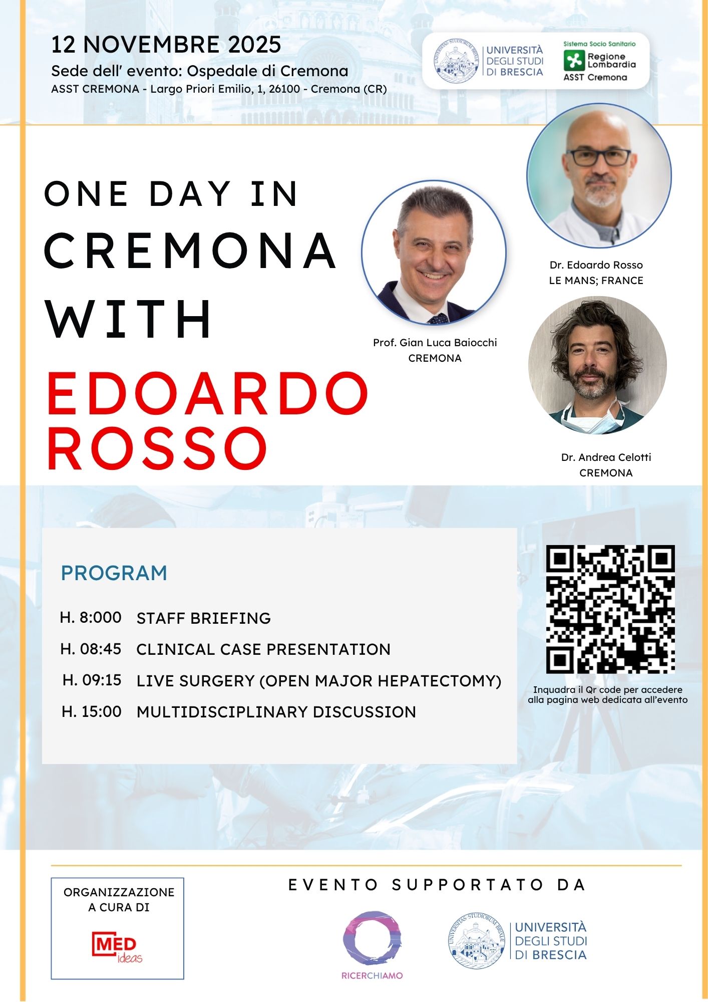 In questa edizione avremo come ospite il Dr. Edoardo Rosso (Le Mans, Francia), insieme al Dr. Andrea Celotti (Cremona) e al Prof. Gian Luca Baiocchi. Il tema della giornata sarà dedicato all’epatectomia maggiore aperta.